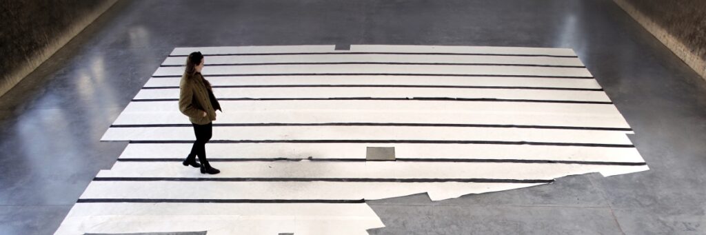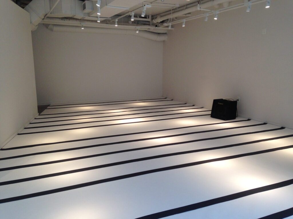 Dittrich transformed WPA into a participatory performance and composition studio. The entire floor was covered in enlarged staff paper. Along one wall in the otherwise empty gallery was a guitar amplifier. As visitors walked the gallery, the sound of their footsteps was picked up by hidden floor sensors and emitted by the amp, producing a sonic architectural landscape. As Dittrich has written, “These works investigate communal aspects of music creation, and give a renewed awareness of the body to the viewer.” Over time, visitors’ footprints will mark and soil the paper, leaving a written record.