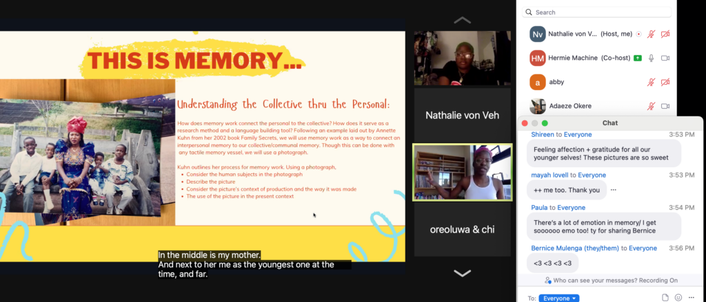 The class includes original writing and workshops by Oreoluwa Akinyode, Mayah Lovell, Fabiola Ching, and Adaeze Okere and is inspired by Afronowism theory, black lesbian esoterics, and the work of June Jordan. A zine relating to the exhibition has also been created. Graphic illustrations are by Saizami Tripathi.