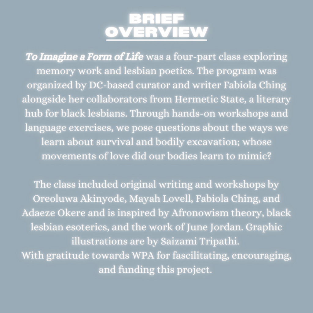 To Imagine a Form of Life is a four-part virtual class exploring memory work and lesbian poetics. The program is organized by DC-based curator